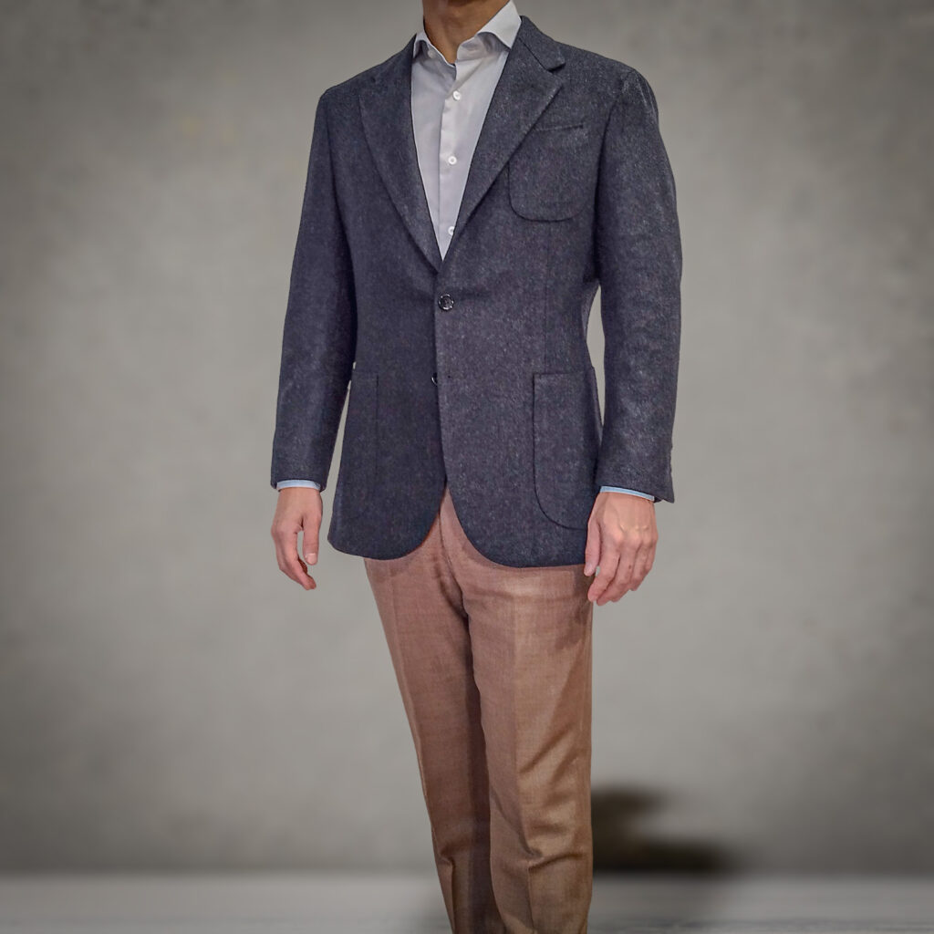 尾州で製作したオリジナル生地で仕立てたジャケットになります。
