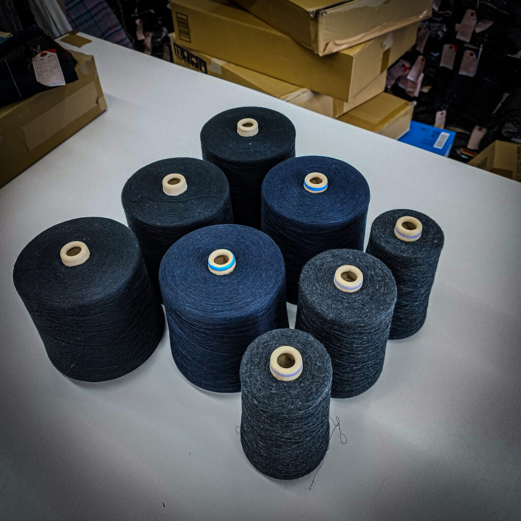 横糸はスーパー140の原料を使用したクロ、ネイビー、チャコールのトップ糸